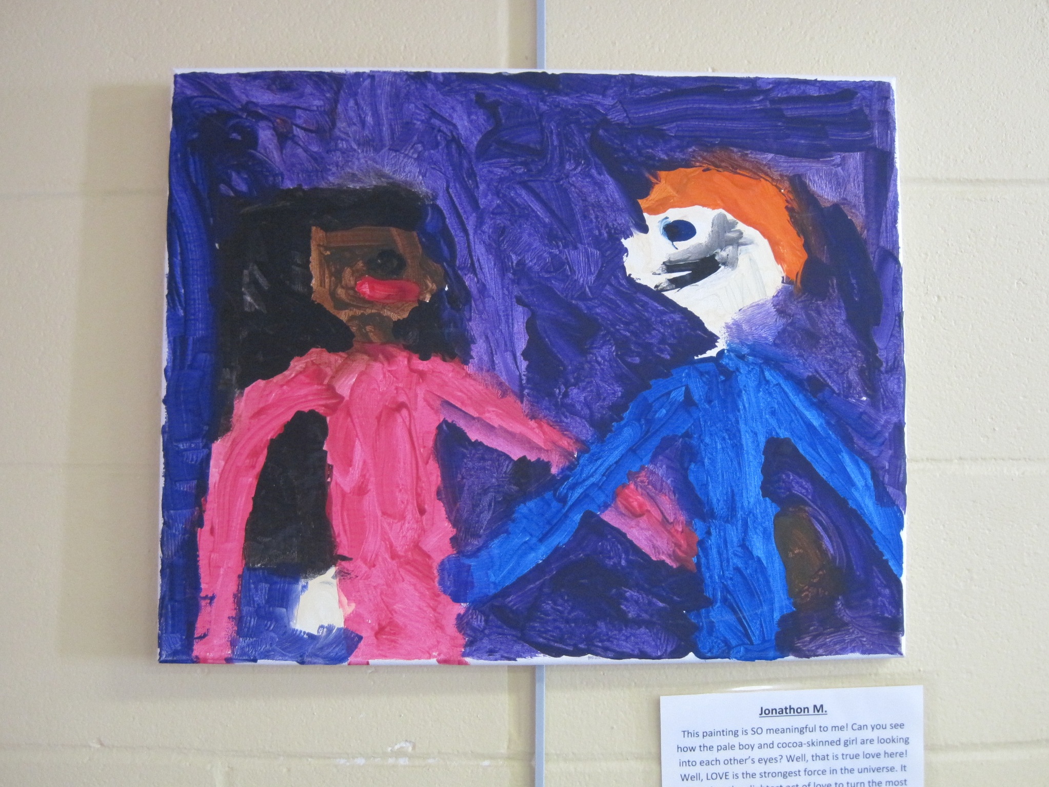 “This painting is SO meaningful to me! Can you see how the pale boy and cocoa-skinned girl are looking into each other’s eyes? Well, that is true love here! Well, LOVE is the strongest force in the universe. It only takes the slightest act of love to turn the most heartless human being into an ever-caring soul. Only love can save the world from destruction, chaos, mass bloodshed, and anarchy. We’re living in a chaotic world right now, and we can stop future disaster with an ounce of love! I’ve decided the moment I got the Holy Spirit that I was going to put an end to mass discrimination and save the world from total destruction. So who’s with me?”